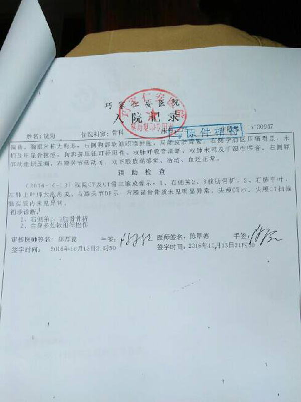 巧家仁安医院的10月13日的检查报告显示,伤者饶菊右侧第2、3前肋骨骨折,全身多处软组织挫伤。
