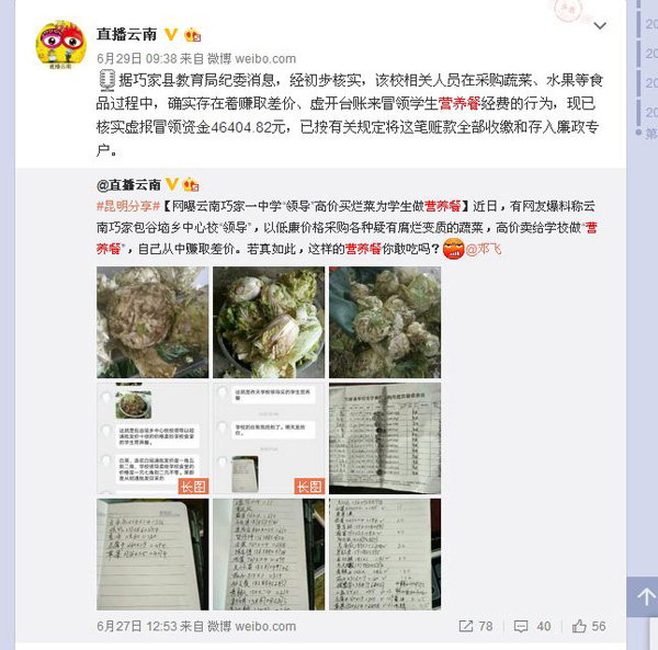 今年6月份包谷垴中心学校营养餐曾被曝使用烂菜赚取差价,举报者正是刘春全。他称,自己看不惯所以举报,因为举报还受到校长家属的威胁。巧家县教育局纪委也在6月29日证实,包谷垴中心学校在采购蔬菜、水果等食品过程中确实存在着赚取差价,冒领学生营养餐的行为,核实冒领资金4604.82元,按相关规定将这笔赃款全部收缴和存入廉政专户。