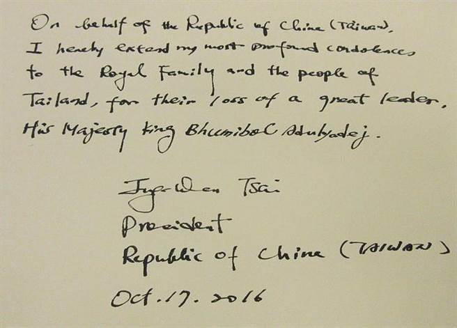 蔡英文悼念泰王竟拼错泰国名 被指“失礼”(图)