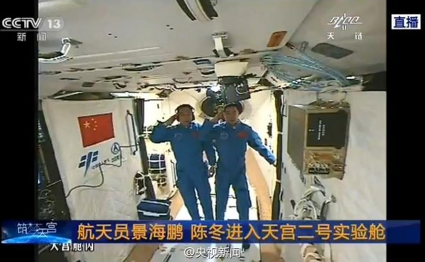神舟十一号飞船于北京时间10月19日凌晨3点半左右与天宫二号成功实施自动交会对接。在合体3个小时后,两名航天员已经进驻天宫二号,并将按计划开展空间科学实验。图为两名航天员向全国人民问好。图片来源:央视新闻官微
