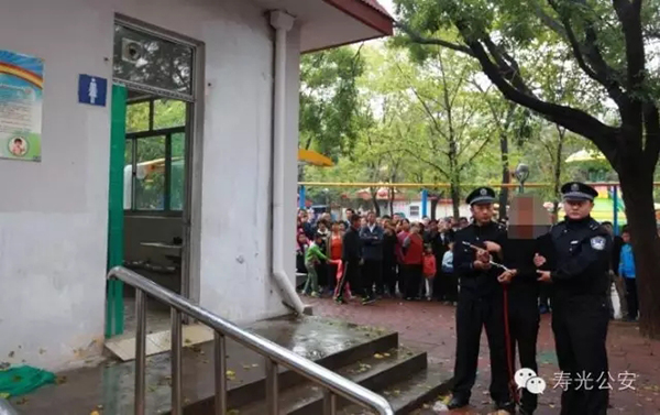 澎湃新闻从寿光市公安局通报配发的图片看到,犯罪嫌疑人戴着手铐,在两名民警的押解下于女厕门前指认犯罪现场。