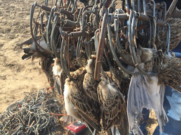 近日,辽宁锦州市再现一起非法捕猎野生鸟类事件,不少野生云雀被鸟夹拦腰斩断。