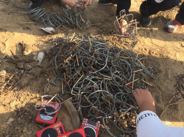 澎湃新闻(www.thepaper.cn)从锦州下辖北镇市森林公安局获悉,10月18日,接到志愿者报警后,森林公安局民警在北镇市廖屯镇赖公村东南侧一片花生地内,发现约200个捕鸟夹子,同时被发现的还有约40只死体野生鸟类。