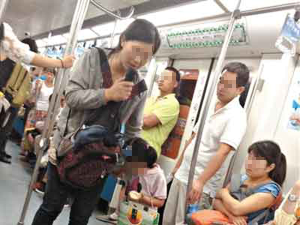 经常乘地铁的上海市民普遍遇到过这样的场景:衣衫破旧的儿童胸前挂着扩音器,一边用话筒唱着《世上只有妈妈好》等歌曲,一边手捧搪瓷缸穿梭在车厢内乞讨。车厢内的乘客无一幸免地被骚扰。不仅如此,还有一些未成年乞讨者采用下跪磕头、搂抱等方式逼迫乘客捐钱。
