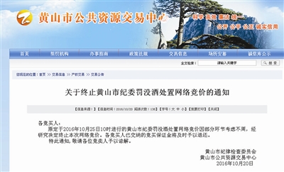10月20日下午,黄山市纪委和黄山市公共资源交易中心发布公告称,原定于10月25日10时进行的黄山市纪委罚没酒处置网络竞价,因部分环节考虑不周,经研究决定终止本次网络竞价,各竞买人已交纳的竞买保证金将及时予以退还。