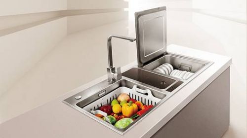 在传统的两个水槽的位置,将其中一个用作传统的水龙头搭配水槽,另外一个做成洗碗机,方太水槽洗碗机采用与水槽一体化安装设计,节省了安装空间,又解决了中国家庭厨房无处安装洗碗机及要额外更改水路的麻烦。方太水槽洗碗机改变了传统洗碗机横着把碗筷放进去的操作方式,而是像我们熟悉的洗衣机一样,掀起盖子,从上往下把碗筷放进去,整个过程我们不需要弯腰,也不需要像面对抽屉一样确认每一格的位置,一目了然,直观并且简单。