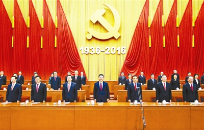 人民大会堂大礼堂内气氛庄重而热烈。主席台上方悬挂着“纪念红军长征胜利80周年大会”会标,帷幕正中是中国共产党党徽和“1936-2016”字标,10面红旗分列两侧。大礼堂二层眺台悬挂标语:紧密团结在以习近平同志为总书记的党中央周围,继承和弘扬伟大长征精神,不忘初心,继续前进,走好新的长征路!