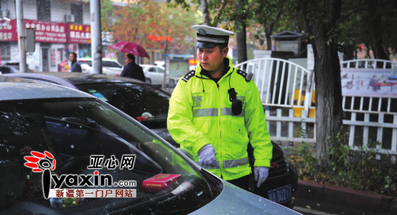 10月24日,乌市南湖东路北二巷内,交警正在查处违停车辆。亚心网记者豆兴军摄
