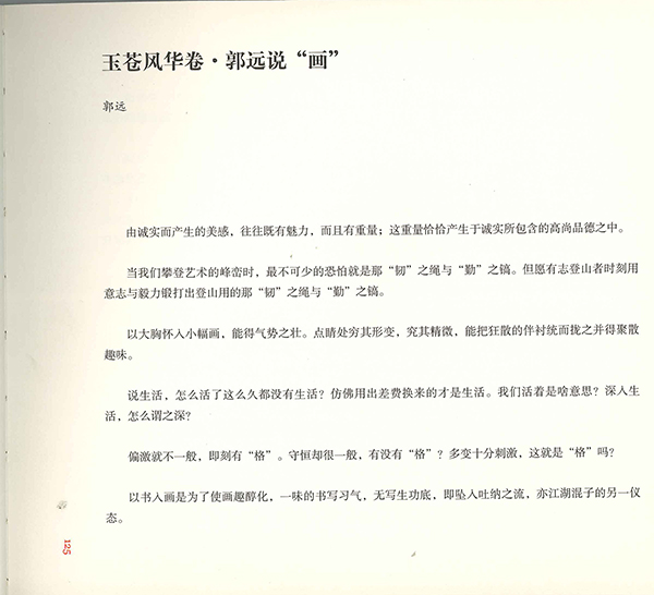 对于这样明目张胆的抄袭,陈运权感叹中国目前艺术环境的急功近利,对学术没有敬畏心。他告诉澎湃新闻,真正让自己感到气愤的是郭远在这本作品集的后记中写的一句话。郭远在作品集125页上写了一篇题为《玉苍风华卷·郭远说“画”》的文章,开篇即是:由诚实而产生的美感,往往既有魅力,而且有重量;这重量恰恰产生于诚实所包含的高尚品德之中。