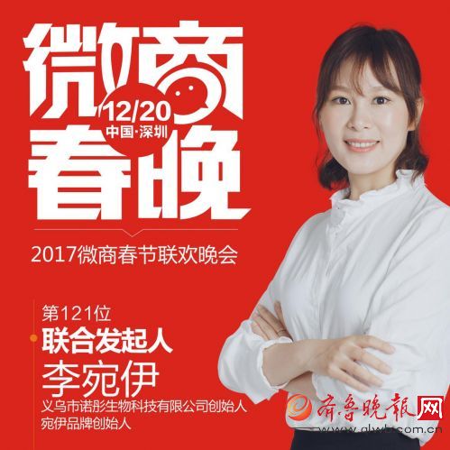 齐鲁晚报济南10月25日讯:近日,义乌市诺彤生物科技有限公司创始人、宛伊品牌创始人李宛伊以联合发起人的身份加入了第二届微商春晚联合发起人队伍。据悉,第二届微商春晚将至少吸引专业微商数万人,大家都是因为相同的选择,不同的经历,不同的身份而聚在一起,微商,是彼此的交集,以微商之名,为自己喝彩,为自己狂欢,这场盛会将在轻松的氛围中进行,听音乐、赏小品,看明星演唱会,定当其乐融融!2016年12月20日,第二届微商春晚将在深圳宝安体育场隆重召开。