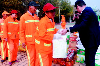 25日上午,五城市政的部分环卫工人聚集在新区篮球场,集中领取慰问品。这次过节,环卫工人们每人领到了两袋面粉、两袋大米和两桶花生油。“我们环卫工有自己的节日,很高兴。过节还领到了礼物,更高兴了!下一步还要继续好好干活!”一名刚刚领到慰问品的环卫工人说,喜悦之情溢于言表。