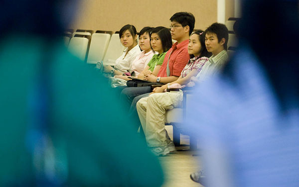 2008年,上海复旦大学光华楼,等待参加香港大学面试的考生。 澎湃资料图