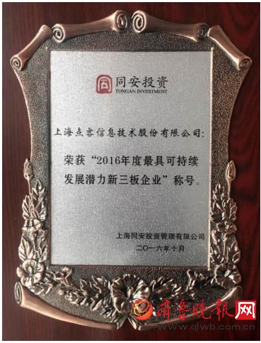 齐鲁晚报讯 历时四个月,经过网络票选、研究员尽调及专家团项目评审等环节后,由同安投资主办、同安定增与新三板投研中心承办的“最具可持续发展潜力新三板企业评选活动”完美落幕。评选结果公布及颁奖仪式于10月26日在2016中国北外滩对冲基金峰会“定增与新三板市场的投资与发展机会”分论坛举办。经过重重激烈竞争,以及最终10余位评审专家的激烈拷问和专业评分,点点客以综合评估第一名的成绩,荣获“2016年度最具可持续发展潜力新三板企业”称号。