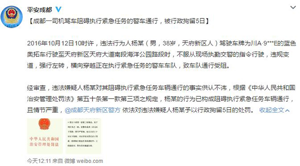 成都市公安局通过官方微博通报:10月12日上午10点,违法行为人杨某(男,38岁,天府新区人)驾驶车牌为川A·9×××E的蓝色奥拓车行驶至天府新区天府大道南段海洋公园路段时,不服从现场执勤交警的指令行驶,违规变道,强行左转,横向穿越正在执行紧急任务的警车车队,致车队通行受阻。经审查,违法嫌疑人杨某对其阻碍执行紧急任务车辆通行的事实供认不讳,根据《中华人民共和国治安管理处罚法》第五十条第一款第三项之规定,杨某的行为已构成阻碍执行紧急任务车辆通行,且情节严重,@成都天府新区警方依法对违法嫌疑人杨某予以行政拘留5日的处罚。