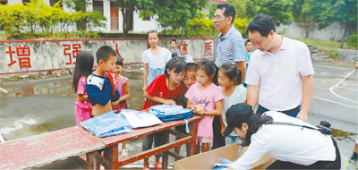 保利南方集团和卓宝科技公司为双头村小学生发放学习用品。