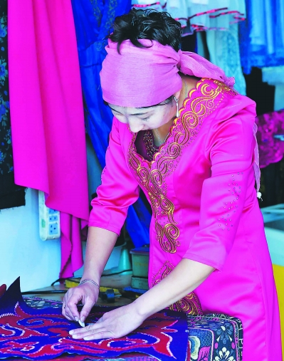 10月21日,呼图壁县雀尔沟镇克孜勒塔斯村一村民在创业园内,制作当地民族风情刺绣品。“十二五”以来,龙岩先后投入援疆资金1100万元,实施游牧民创业园、村文化活动中心和120户牧民定居工程等项目。