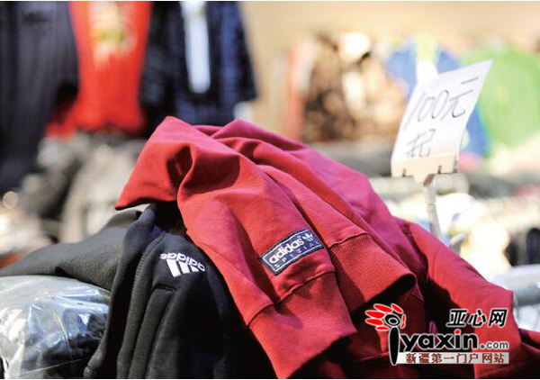 11月1日,乌市南湖西路的这家外贸服装店,各种服装堆积如山,假冒阿迪达斯、耐克品牌的服装混杂在里面。亚心网记者喻义昌摄