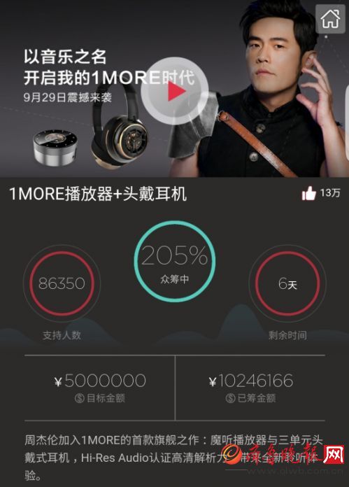 9月29日,1MORE万魔耳机与华语天王周杰伦在北京召开了“我的1MORE时代 万魔耳机x周杰伦2016战略发布会”,并在发布会上发布了三款年度战略新品:1MORE魔听播放器、1MORE三单元头戴式耳机和1MORE双单元耳塞式耳机。现在,1MORE魔听播放器+三单元头戴式耳机正在众筹中! 超值优惠音乐组合限量发行!当前进度已超过205%,剩余时间6天,依旧等待有品位的音乐爱好者!