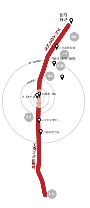天府大道将串联起天府国际金融中心、天府创新中心、四川科技馆、三星堆博物馆、青白江国际物流园区以及美德澳等驻蓉总领馆,直达天府新区和德阳新城。
