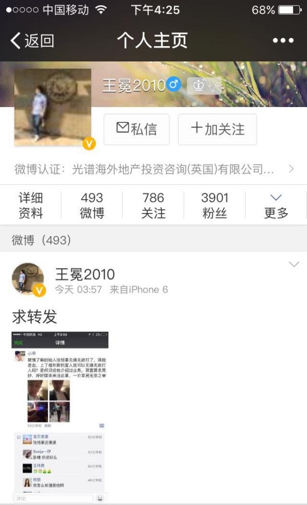 记者在微博认证为“光谱海外房地产投资咨询(英国)有限公司的董事长兼CEO王冕”的微博主页上查到,上述人士确实发布了一张相关的手机截图并求转发,称自己“被饿了么创始人张旭豪无缘无故打了,满脸是血”。他透露自己曾给他(张旭豪)介绍过业务,认为他莫名其妙,呼吁媒体关注此事。