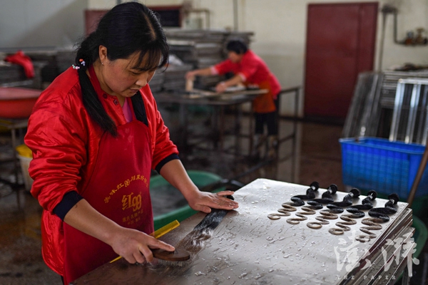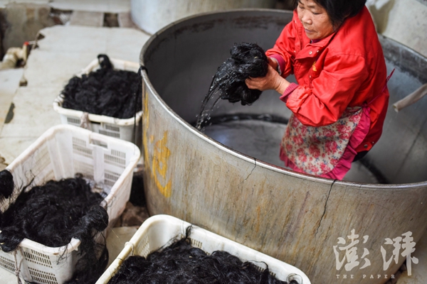 【消毒染色】港集村一家工厂内,去除杂质的人发在经过消毒后,会根据客户需求染上不同颜色,图为工人韦强在调试染色效果。