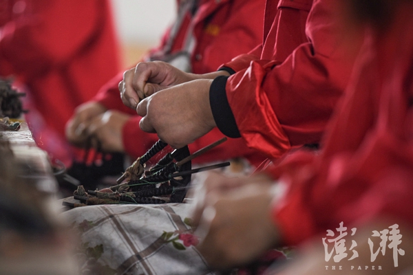 【裁剪发帘】排好的发帘通常很长,为避免影响下一道定型工序的操作,一位女工将发帘裁剪成不超过定型铝管的长度。