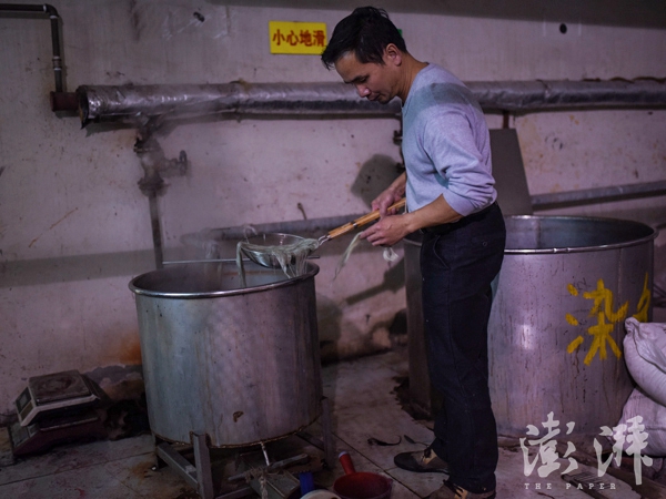 资深漂染工韦强拿着手机里的图片比对染色效果,客户需要的发色也常常随着市场的需求而变化。