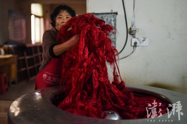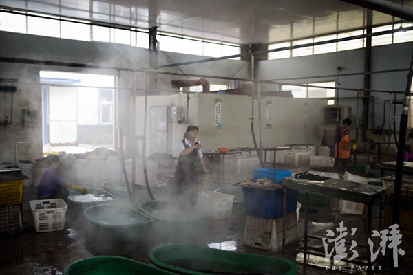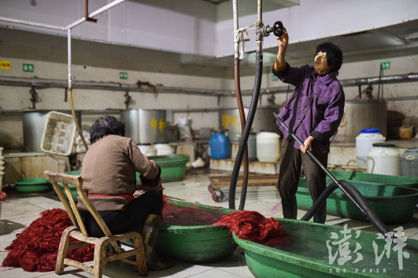 【漂洗】人发在漂染后,会残留药品,需要通过清洗三道才能进入烘干区。工厂通常用热气来加热水,在水温达到要求后,张奶奶(右)把热气阀关闭。