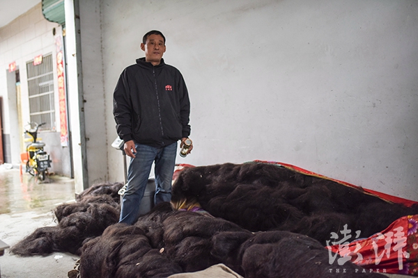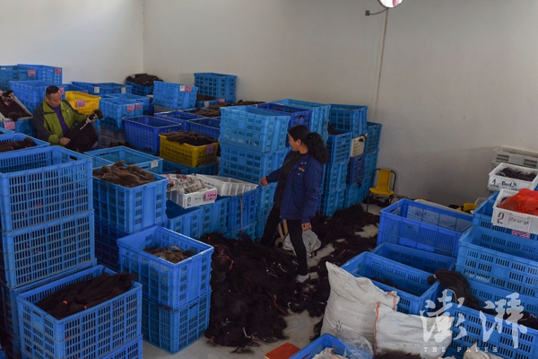 【收集】港集村一家工厂的仓库里,摆满了厂家收购的人发,这些成捆的人发都经过家庭小作坊的初步加工。