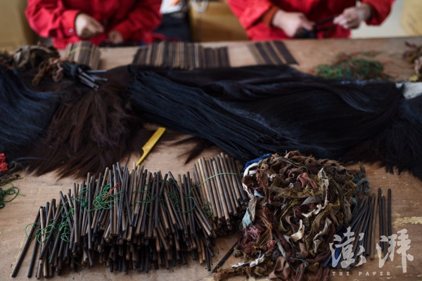 【卷发】发帘会根据长短进行不同的操作,较长的头发会进行卷发处理。图为卷发使用的小木棍、皮筋和碎布条。