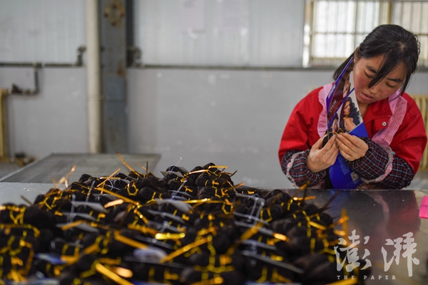【包装】假发生产的最后一步程序。一位女工给成品挂上吊牌,并在内放置专用纸团,以免产品变形。
