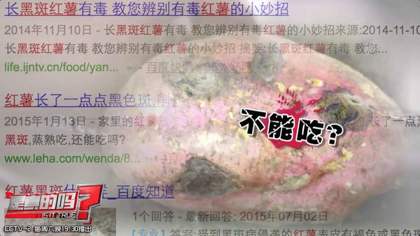 专家采访和检测数据表明,在病变部位一厘米外的薯肉就已经检测不到甘薯酮和甘薯酮醇等有毒物质了。同时专家还告诉我们,并不是所有长了黑色斑块的红薯都会产生毒素。