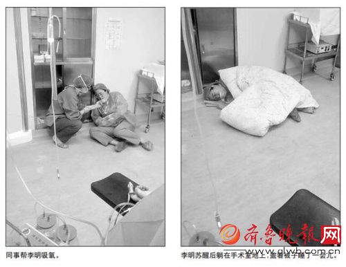 然而,就在大家准备走出手术室时,还没来得及摘下口罩和手套的李明突然晕倒在手术室门口的地上。看到李明倒地,李明的同事马上将她搀起,并给她插上氧气,过了好长时间,李明才慢慢苏醒过来。苏醒后的李明就地躺下,盖上手术室内的被子睡了一会儿。听说李明晕倒在手术室,同事纷纷赶来,有的送来粥,有的围在她身边照顾。同事建议立即将李明送回家休息,但李明坚持为刚才的三名产妇写完病历、医嘱,直到早上8点交完班后才回家。