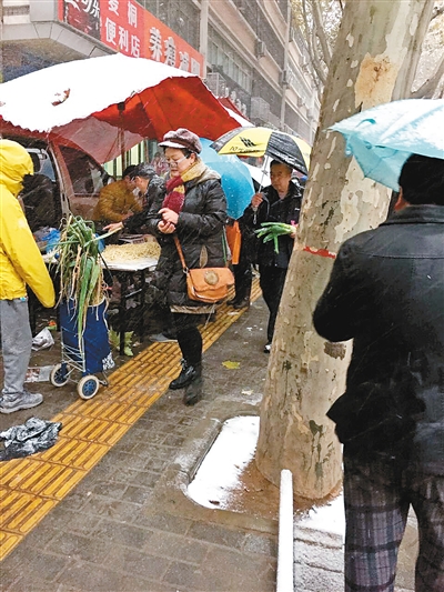 11月22日,西安迎来了今冬第一场雪,天气寒冷,然而这并没有影响小商贩的“热情”。早上8时许,记者看到,从邮电十所家属院一直到邮电学院北门的道路两侧挤满了各种小商贩,三轮车、摩托车、货架铁棚纵横交错,叫卖声音不绝于耳。还有些市民骑着电动车和自行车直接将车子横在路上,和小商贩讨价还价,行人经过此处只能绕着走。