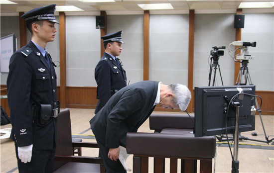 11月24日,被告人杨栋梁在最后陈述阶段鞠躬致歉。王鑫刚/摄(新华社发)