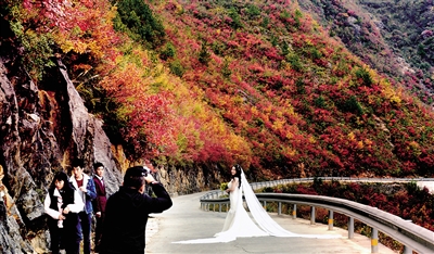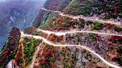 兰英大峡谷挂壁公路如弯月一般在彩林中穿行。