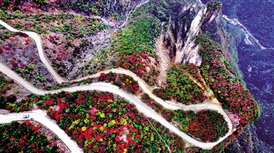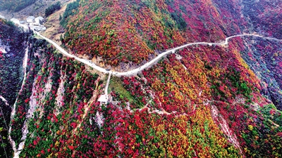 兰英大峡谷挂壁公路穿过色彩斑斓的层林。