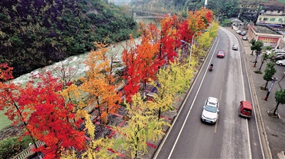 巫溪新县城通往兰英大峡谷的道路旁彩林如画一般。