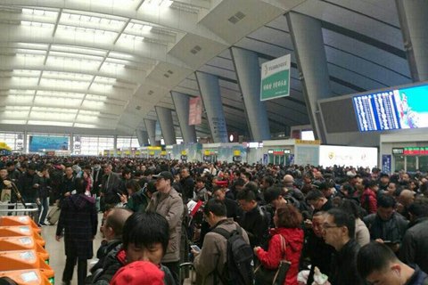北京南站多趟列车晚点,旅客滞留。网友供图