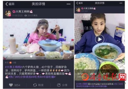 齐鲁晚报讯 食量惊人却怎么吃也不会胖,这样的“大胃王”够不够招仇恨?近日,在视频与直播社区美拍上,一名来自东北的90后女生桐桐,因胃口极佳、直播吃饭数量惊人而爆红。据悉,大胃王桐桐每天在美拍上都会有一个 “吃秀直播”以记录吃饭日常,与网友分享。城市快报报道称,目前桐桐靠着直播吃饭已经月入过万。
