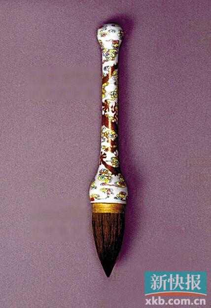 此笔管瓷质中空,施粉彩釉,描金云龙纹,下端装紫毫笔头,上端篆书“大清乾隆年制”款。笔为文房四宝之一。文房指书房、画室,四宝指笔、墨、纸、砚四种书画工具。清代文房四宝的制作工艺有很高的水平,其名品、精品堪称为高雅的工艺品,有的在当时价值连城。如制墨名家程一卿所制的墨,就有“海内宝一卿墨者,黄金不啻也”的说法。