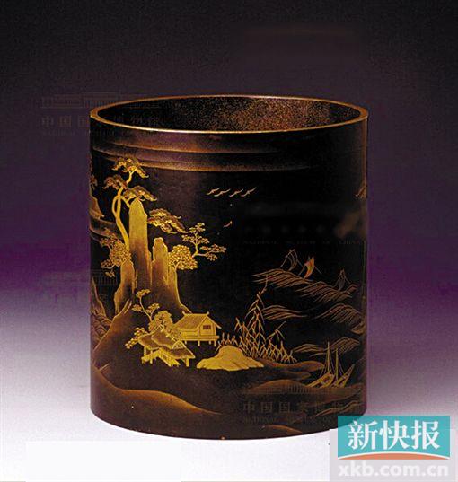 这是日本国赠送给清朝的礼物。描金漆在日本称为“商绘”。中国的漆技传到日本后得到发展,某些方面超过了中国。明清时期,大量日本金漆、描金漆等流入中国,这件山水大笔筒是一件日本制作的、十分精美的描金漆器。
