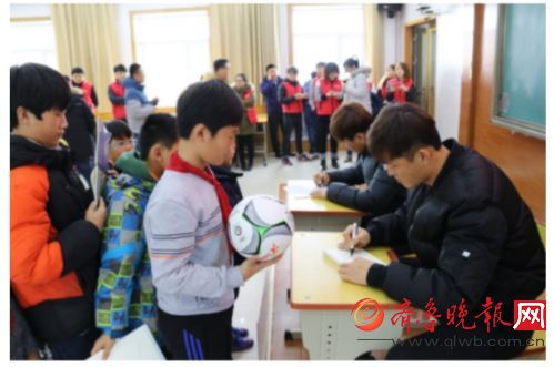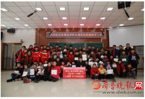 齐鲁晚报12月07日讯:(12月5日,延边)中超延边富德足球队队员崔民、李浩和俱乐部工作人员随同吉林韩正人参有限公司(以下简称:吉林韩正人参)企业员工一行访问了当地三所小学并捐出爱心基金。本次活动由延边富德足球俱乐部及官方红参产品赞助商吉林韩正人参共同主办,以提高青少年对足球的热爱并推动延边足球的发展为主要目的。吉林韩正人参此前已连续2年提供足球爱心基金,本次也携企业自愿者与选手们向每所学校捐赠1万元的爱心基金。