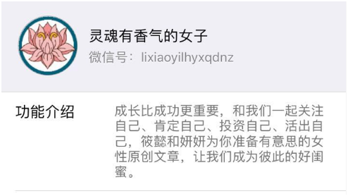 灵魂有香气的女子是畅销书女作家李筱懿和闺蜜陶妍妍,在2014年7月创立的一个主打女性主义的原创自媒体公众号,灵感来源于李筱懿同名畅销书籍《灵魂有香气的女子》。公众号致力于分享生活微智慧,输送情感正能量,是粉丝的闺蜜和心灵树洞。
