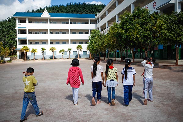 2016年11月18日,云南磨憨双拥小学,一群跨境读书的小朋友走在校园里。