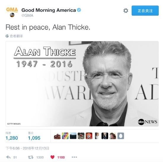 据美国《洛杉矶时报》12月13日报道,在80年代著名美国情景剧《成长的烦恼》中,为众多父母树立榜样的知名演员艾伦锡克因心脏病发作去世,享年69岁。他的儿子确认了艾伦锡克的死讯。据悉,艾伦死后将可能捐赠部分器官。