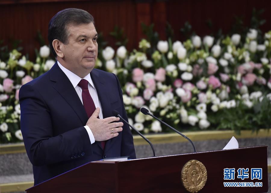 12月14日,在乌兹别克斯坦首都塔什干,米尔济约耶夫宣誓就职。乌兹别克斯坦当选总统米尔济约耶夫14日在首都塔什干正式宣誓就职,任期为5年。 新华社/美联
