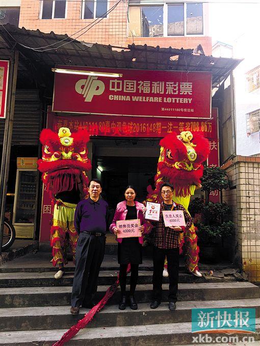 昨日下午,最近马不停蹄庆功的广州市福彩中心又带着舞狮队赶往中奖投注站举行庆祝仪式,并向站点颁发了一等奖中奖奖牌,并向站主及销售员分别送上4000元奖励金,勉励站点凭借大奖东风再接再厉,再中大奖。