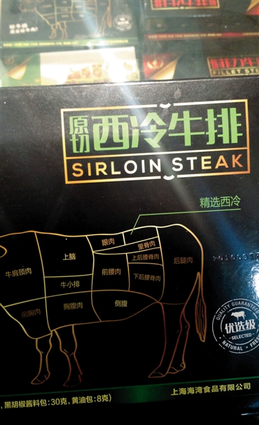 上海海湾食品有限公司生产的一款188g装牛排产品,在配料表中注明添加了卡拉胶、谷氨酰胺转氨酶等食品添加剂,但在产品包装上却冠以醒目的“原切菲力牛排”。另一款标称为“原切西冷牛排”的产品,配料表显示也添加了卡拉胶、黄原胶、三聚磷酸钠等食品添加剂。两款产品执行标准均为《SB/T10379-2012速冻调制食品》。