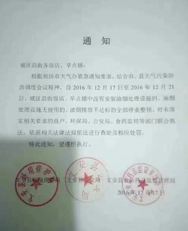 这份获张永亮证实的通知由文安县环保局、县公安局、县食药监局3部门联合下发。通知指出,根据廊坊大气办紧急通知要求,结合市、县大气污染防治调度会议精神,自2016年12月17日至2016年12月21日,城区沿街饭店、早点铺中没有安装油烟处理设施的、油烟处理设施无使用的、油烟排放不达标的全部停业整顿。对未落实相关要求的商户,环保局、公安局、食药监局等部门联合执法,依据相关法律法规依法进行查处和相应处罚。
